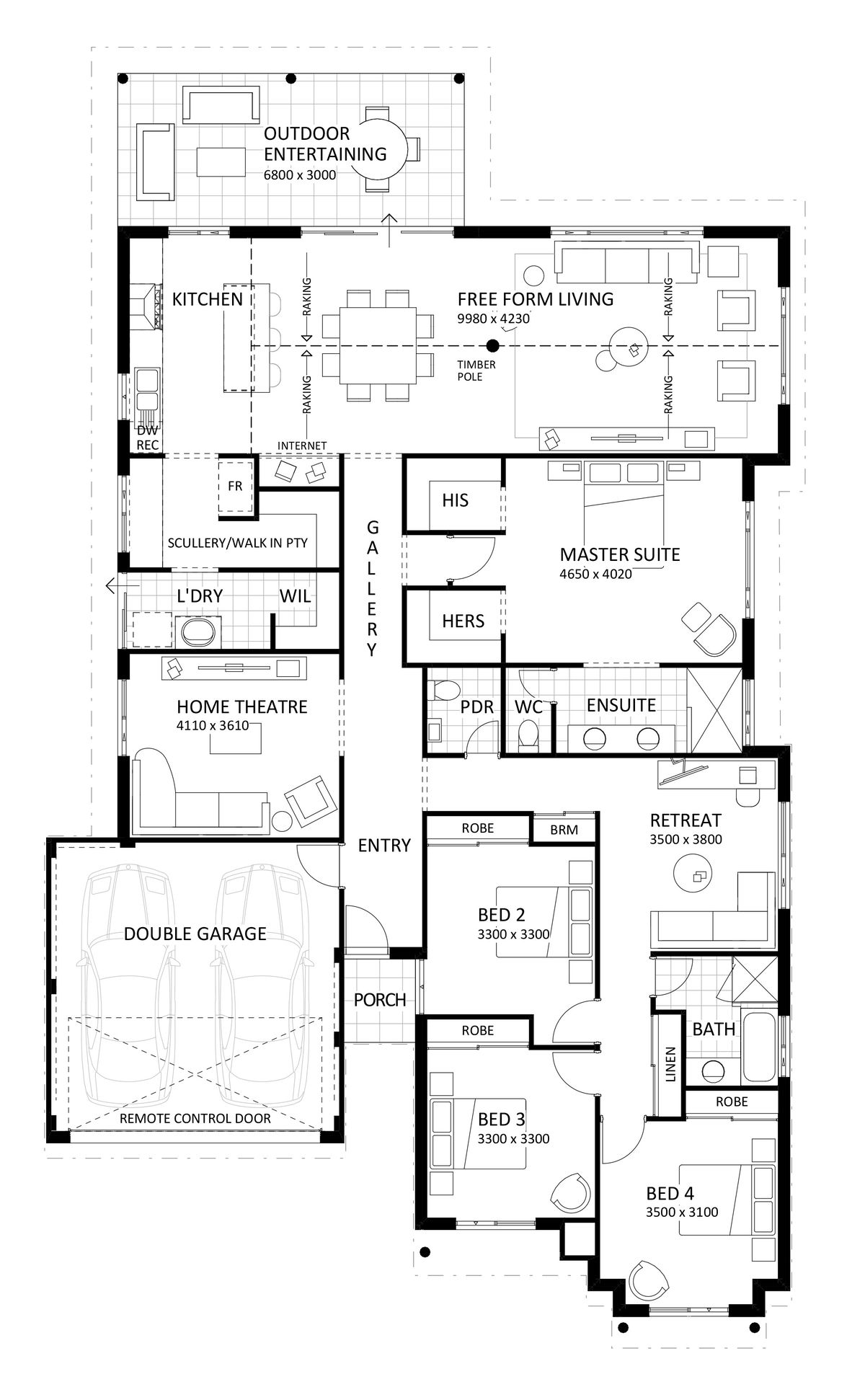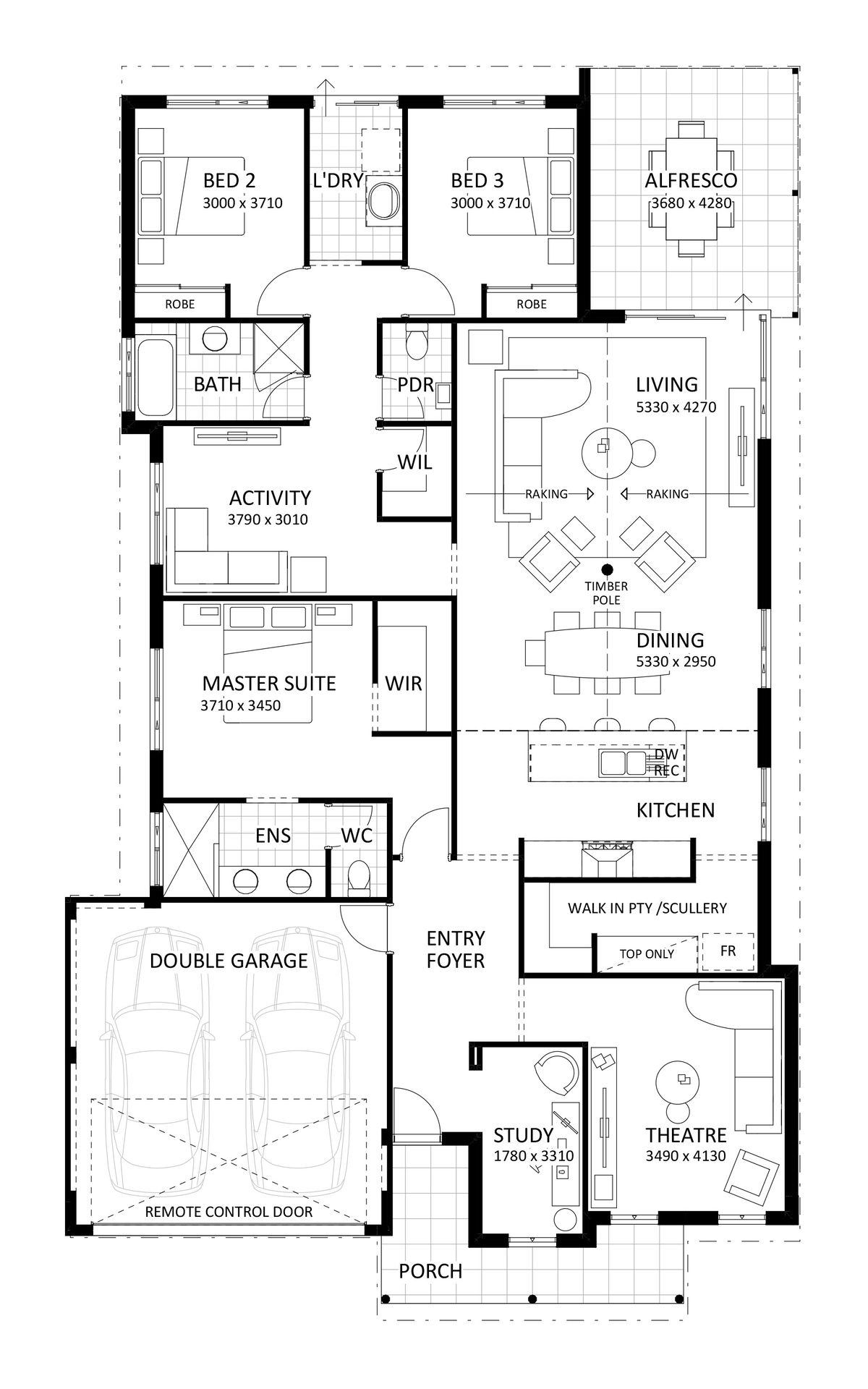 Leaning seamlessly into the vernacular of coastal views and seaside living, the Seaside Retreat blurs the lines between indoor and outdoor spaces. A breeze way intersects the double garage and entry, serving as an informal and charming introduction to this three-bedroom home.